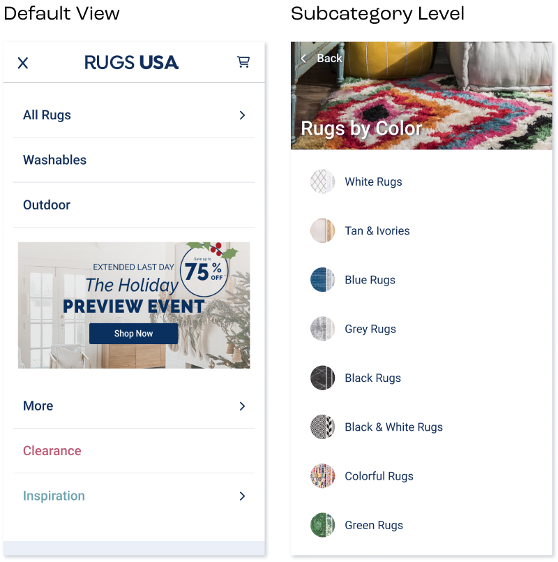 Leading the revamp of Rugs USA's site navigation, I managed the project from benchmarking through to QA, integrating a highly customizable headless CMS via Contentful. This redesign, encompassing user research, wireframes, prototyping, and CMS data modeling, significantly empowered our marketing team. It enabled swift, independent updates for desktop and mobile, including localized versions for different markets like Canada.